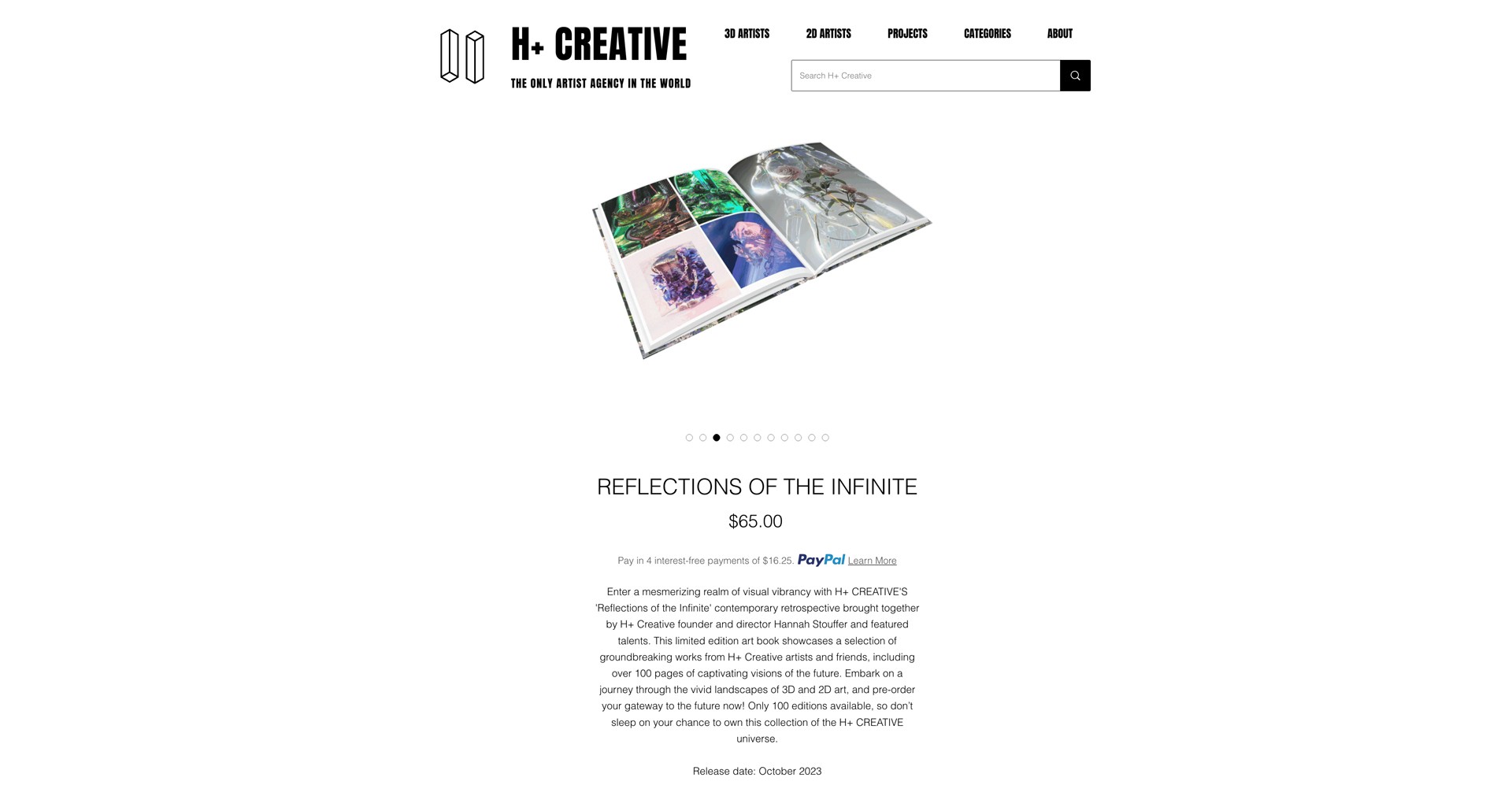 I was selected as a featured artist in H+ Creative’s limited-edition book, Reflections of the Infinite — a curated anthology of contemporary digital art published in a hand-numbered run of only 100 editions. The collection highlights celebrated works from the H+ roster, showcasing globally recognized digital artists across 3D, motion, and conceptual design.