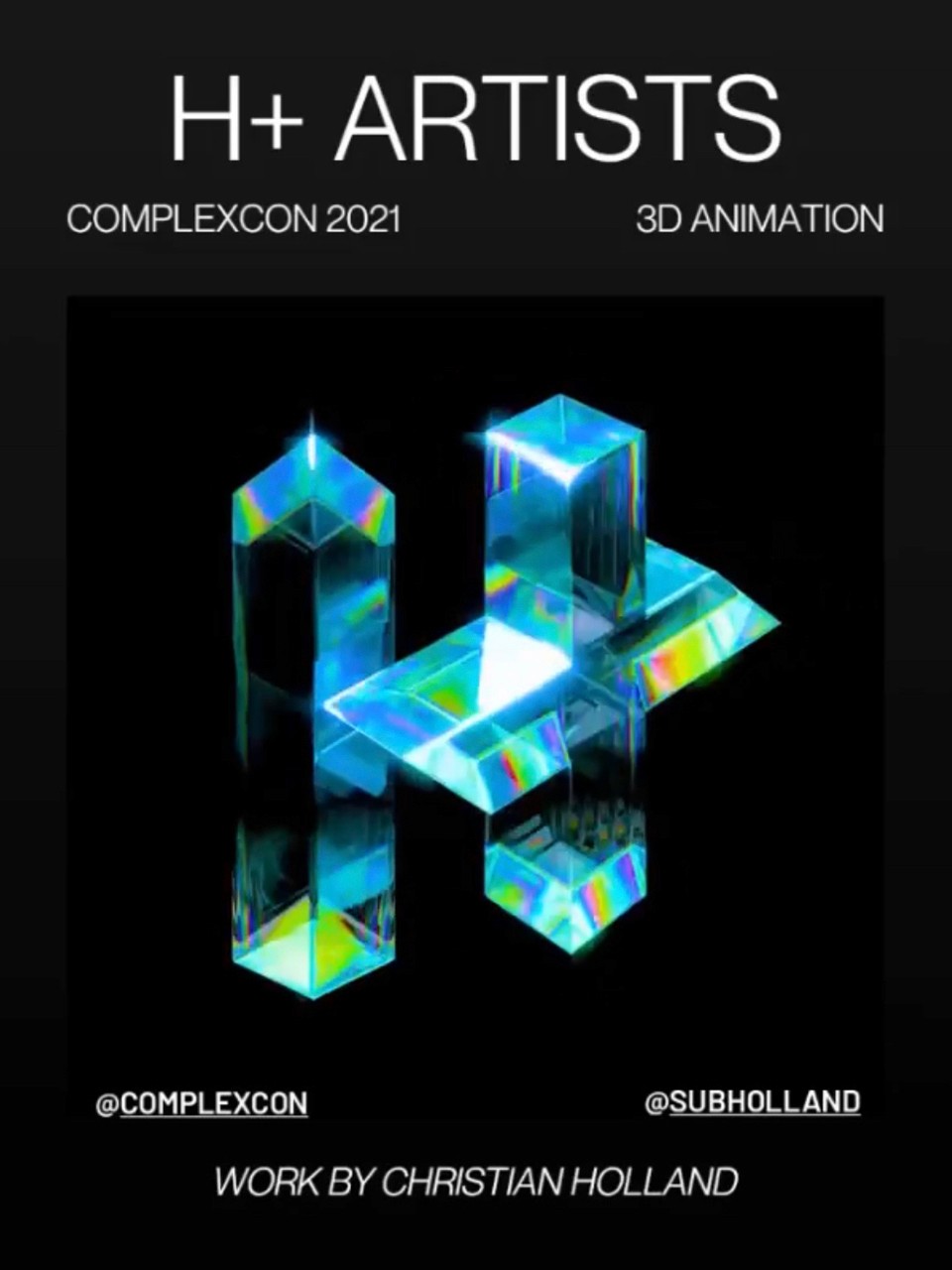 Built in Blender 3D and refined in the Adobe Creative Suite, the animation was featured prominently at the H+ booth during ComplexCon, where it served as a dynamic piece across digital screens and event displays. The artwork was also adapted into print materials and transformed into both digital and physical collectible items, expanding its presence across multiple mediums and touchpoints.