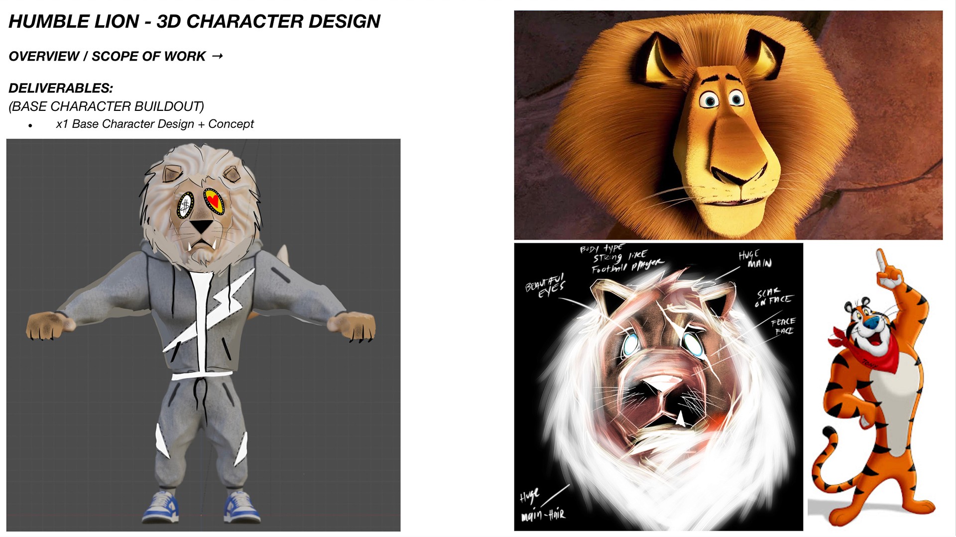Collaborating with King Saladeen under his art direction, I brought the “Humble Lion” character to life through 3D sculpting, modeling, and texturing, transforming Saladeen’s original concept sketches into a fully realized digital figure. Created for Micah Parsons, the project serves as the visual centerpiece for an upcoming children’s book celebrating humility, strength, and creativity.